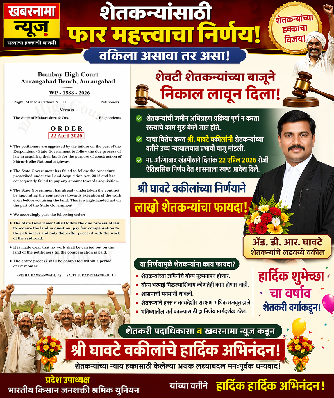 рд╢рд┐рд░реВрд░тАУрдмреЗрд▓реНрд╣реЗ рд░рд╛рд╖реНрдЯреНрд░реАрдп рдорд╣рд╛рдорд╛рд░реНрдЧрд╛рд╕рд╛рдареА рдЬрдореАрди рдмрд╛рдзрд┐рдд рдЭрд╛рд▓реЗрд▓реНрдпрд╛ рд╢реЗрддрдХрд▒реНрдпрд╛рдВрдирд╛ рдпреЛрдЧреНрдп рдореЛрдмрджрд▓рд╛ рди рджреЗрддрд╛ рдХрд╛рдо рд╕реБрд░реВ рдХреЗрд▓реНрдпрд╛рдкреНрд░рдХрд░рдгреА рдЙрдЪреНрдЪ рдиреНрдпрд╛рдпрд╛рд▓рдпрд╛рдиреЗ рд╢рд╛рд╕рдирд╛рд▓рд╛ рдЭрдЯрдХрд╛ рджрд┐рд▓рд╛ рдЖрд╣реЗ. рдпрд╛рдкреНрд░рдХрд░рдгреА рдиреНрдпрд╛рдпрд╛рд▓рдпрд╛рдиреЗ рд╕реНрдкрд╖реНрдЯ рд╢рдмреНрджрд╛рдВрдд рд╕рд╛рдВрдЧрд┐рддрд▓реЗ рдЖрд╣реЗ рдХреА рднрд░рдкрд╛рдИ рджрд┐рд▓реНрдпрд╛рд╢рд┐рд╡рд╛рдп рд░рд╕реНрддреНрдпрд╛рдЪреЗ рдХрд╛рдо рдкреБрдвреЗ рдиреЗрддрд╛ рдпреЗрдгрд╛рд░ рдирд╛рд╣реА.